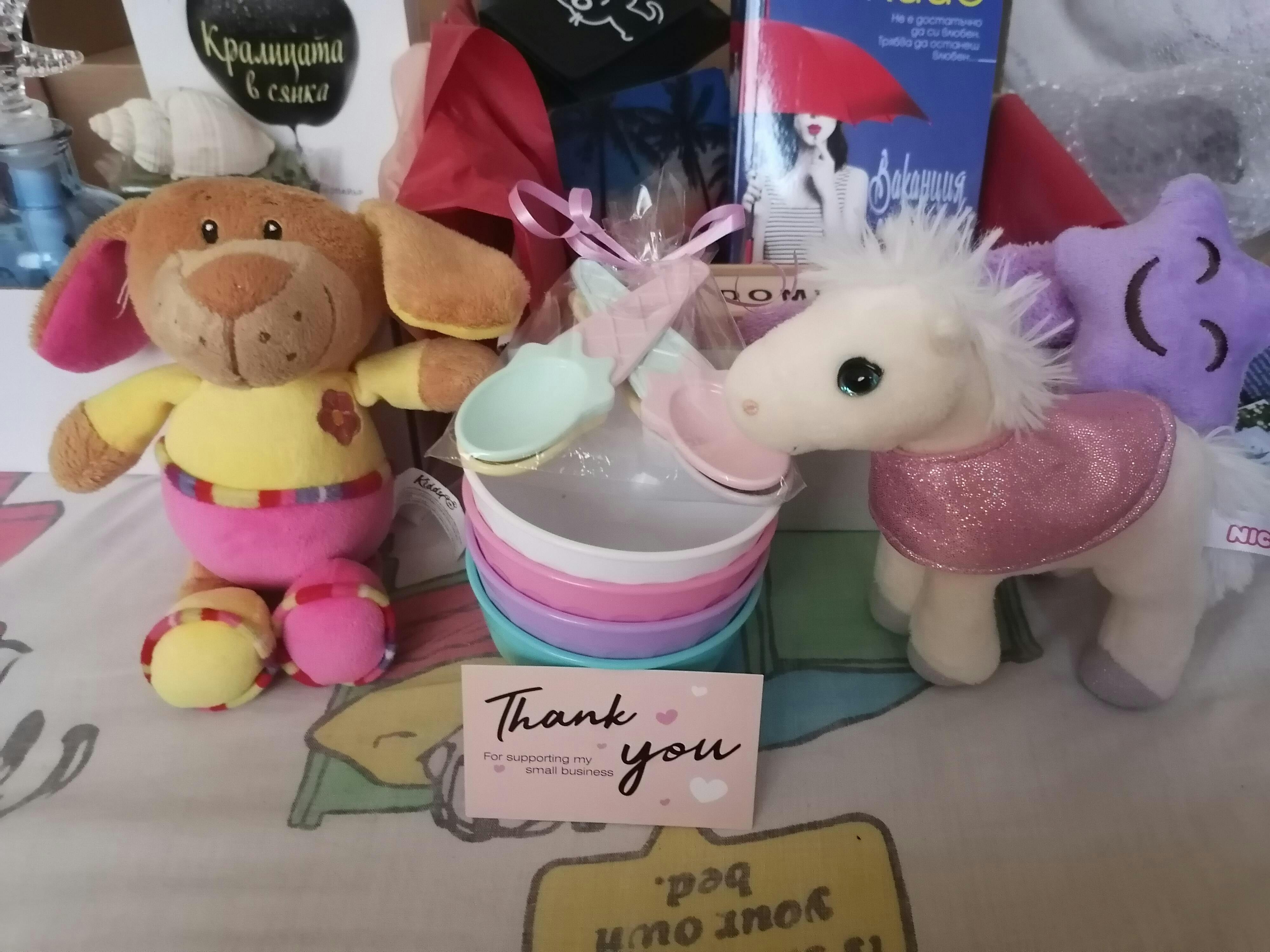 🎀 Подаръчета: 1. Стъклено шише с писмо. Ръчно оформена декорация + "писмо в бутилка" с мъдри сентенции 2. Кръгла поставка - свещник в сиво с чаена свещичка към нея 3. Четири броя цветни купички. Идеални за сервиране на сладолед през горещите летни дни 4. Зелен сапун със зехтин, чудесен за всички типове кожа, благодарение на специалните си съставки 5. Ароматизатор за гардероб с аромат на цветя.